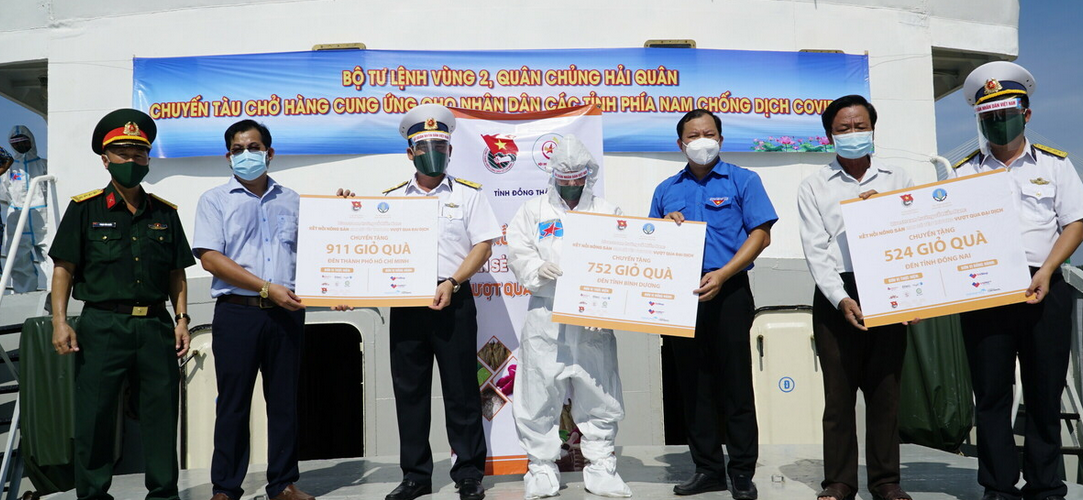 Tàu Hải quân Vùng 2 chở gần 30 tấn nông sản gồm gạo, khoai, bắp, chanh tặng người dân ở TP HCM, Bình Dương và Đồng Nai, chiều 18/8.