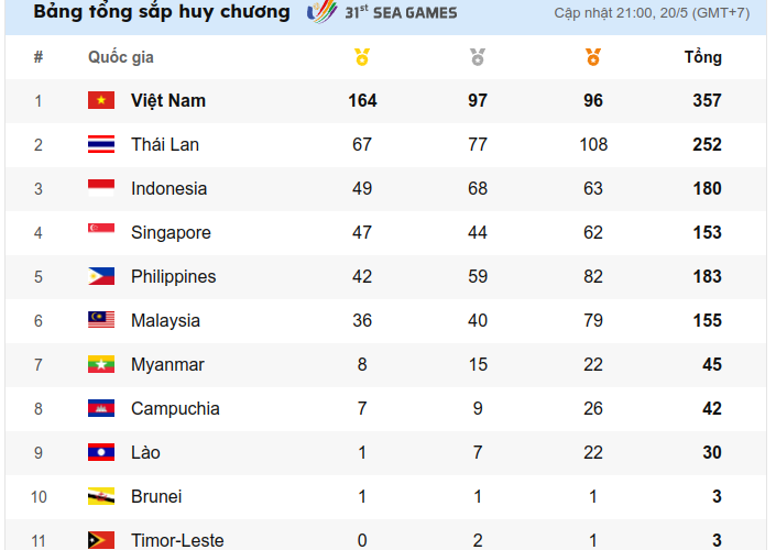 Với 164 HC vàng, chủ nhà tiếp tục dẫn đầu bảng tổng sắp. Ở phía sau lần lượt là Thái Lan (67), Indonesia (49), Singapore (47) và Philippines (42).