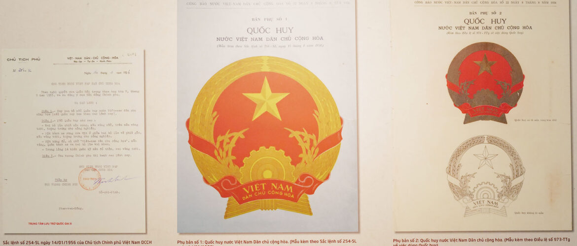 Ngày 14/1/1956, Chủ tịch Hồ Chí Minh ký sắc lệnh về việc ban bố mẫu Quốc huy của nước Việt Nam Dân chủ Cộng hòa. Mẫu gồm: Hai lô lúa chín uốn cong màu vàng sẫm, trên nền vàng tươi, tượng trưng cho nông nghiệp; một bánh xe răng cưa đặt ở giữa hai bó lúa về phía gốc, màu vàng tươi, tượng trưng cho công nghiệp; một băng đỏ, có chữ “Việt Nam Dân chủ Cộng hòa” màu vàng, quấn bánh xe và hai bó lúa với nhau; trong lòng là hình Quốc kỳ nền đỏ thắm, sao vàng tươi.