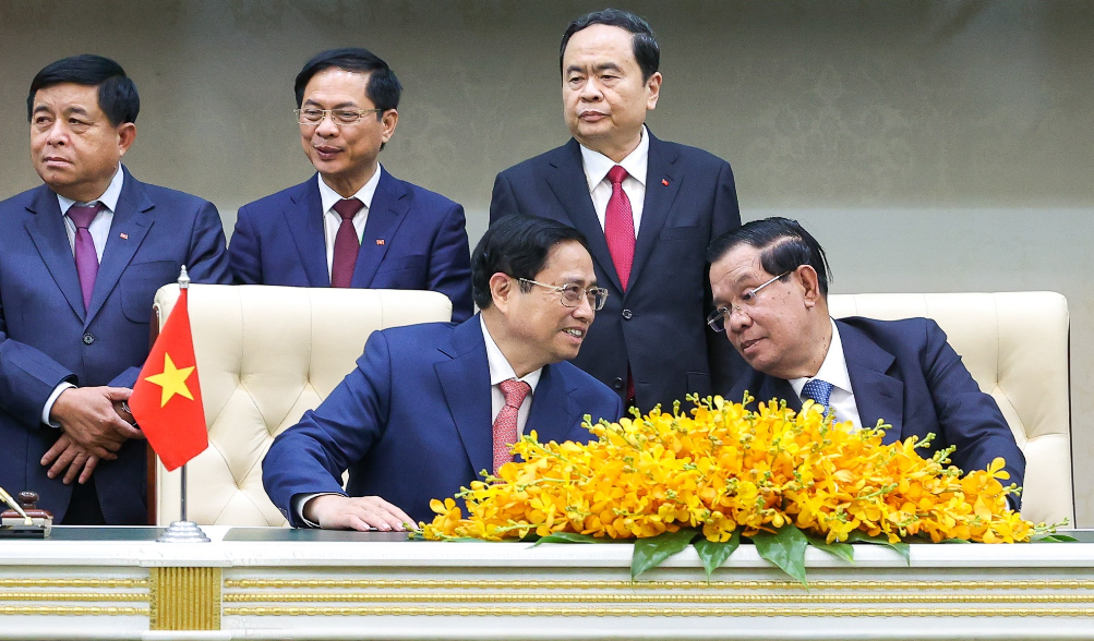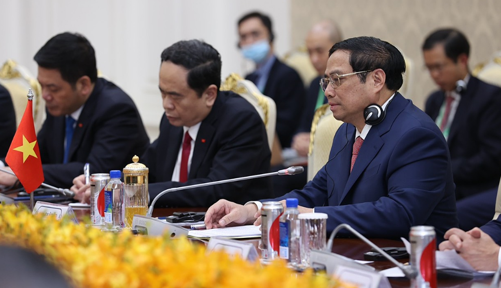 Tại cuộc hội đàm ngày 8/11 ở Cung Hòa bình, thủ đô Phnom Penh, Thủ tướng Phạm Minh Chính và Thủ tướng Campuchia Hun Sen khẳng định quyết tâm củng cố và phát triển hơn nữa quan hệ láng giềng tốt đẹp, hữu nghị truyền thống, hợp tác toàn diện, bền vững lâu dài giữa hai nước.