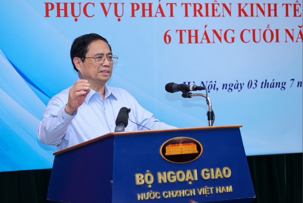 Thủ tướng Phạm Minh Chính phát biểu tại hội nghị về ngoại giao kinh tế, chiều 3/7.