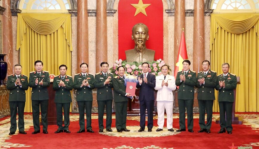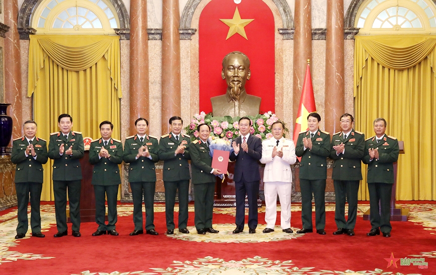 Chủ tịch nước Võ Văn Thưởng trao quyết định thăng quân hàm lên thượng tướng cho Phó chủ nhiệm Tổng cục Chính trị quân đội Trịnh Văn Quyết, sáng 8/8.